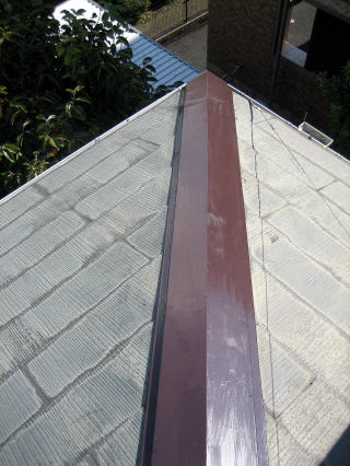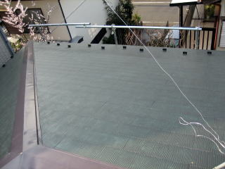 カラーベストの塗装1回目 塗装2回目(右側) 屋根の端に柵を取り付け 雨水は浸透せず、塗装効果有り